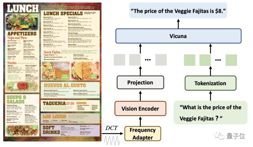 在分辨率问题的策略上,与现有方法不同,DocPedia从频域的角度出发去解决。给定一张高分辨率文档图像,DocPedia首先提取其DCT系数矩阵。该矩阵在不损失原图像图文信息的前提下,将其空间分辨率下采样8倍。