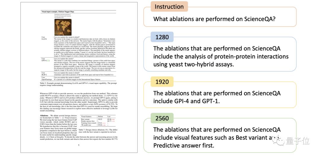 消融实验结果表明,分辨率的提升和感知-理解联合微调是DocPedia表现增强的两大关键因素。下图对比了DocPedia对于一张论文图像以及同一个指令,在不同输入尺度下的回答。可以看到,当且仅当分辨率提升至2560×2560时,DocPedia回答正确。