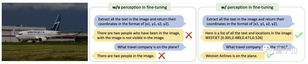 下图则对比了DocPedia对于同一张场景文字图像以及同一个指令,在不同微调策略下模型的回答。由该示例可以看到,进行了感知-理解联合微调的模型,能准确地进行文字识别和语义问答。