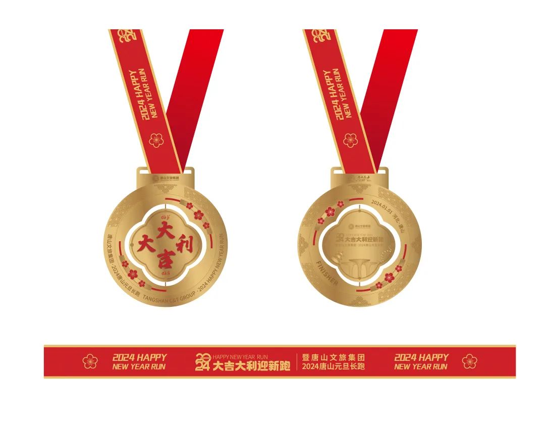 赛事奖牌整体设计凸显迎新的理念,将「太阳」、「祥云」、「腊梅」等元素与「比赛地地标」元素相结合。可旋转的奖牌工艺设计,让这份赛事荣誉展现出独特的灵动质感。
