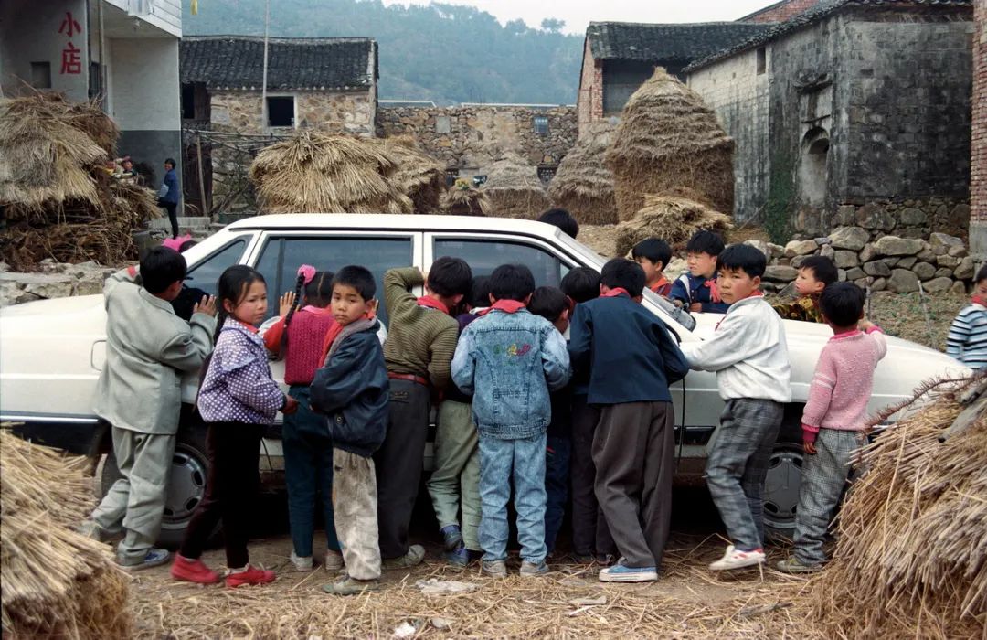 1996年3月7日,台州市椒江区章安小学的孩子围观桑塔纳汽车。王永江 摄