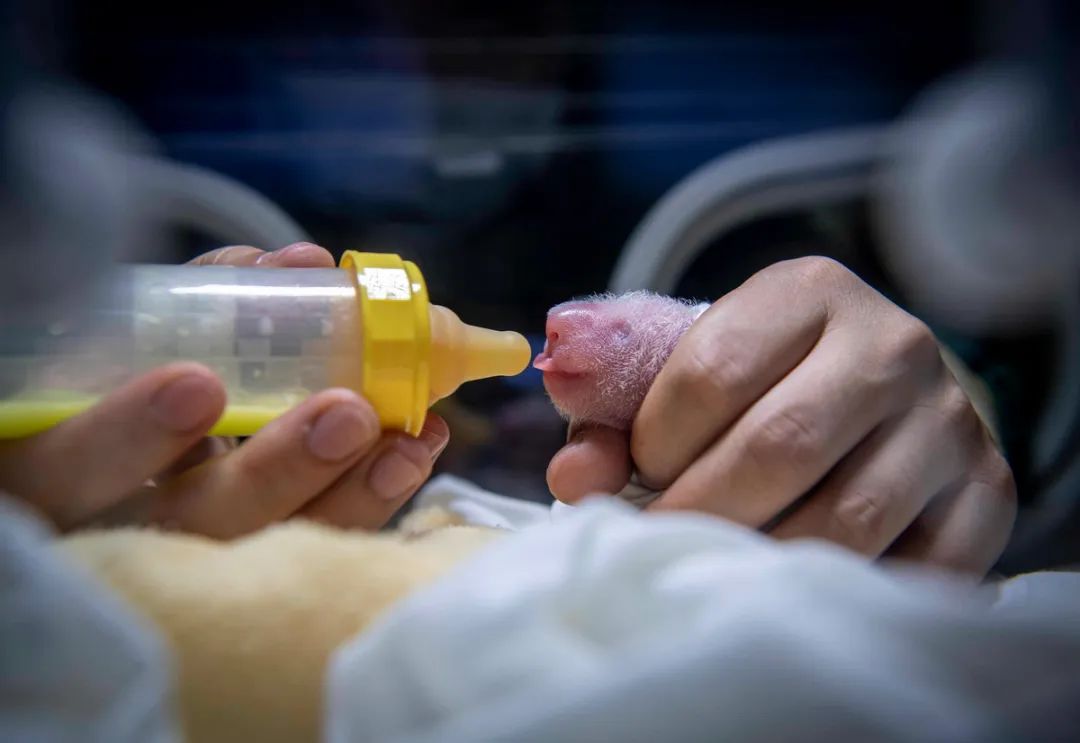 2021年7月18日,神树坪基地,科研人员给刚出生的熊猫幼崽喂奶。何海洋 摄