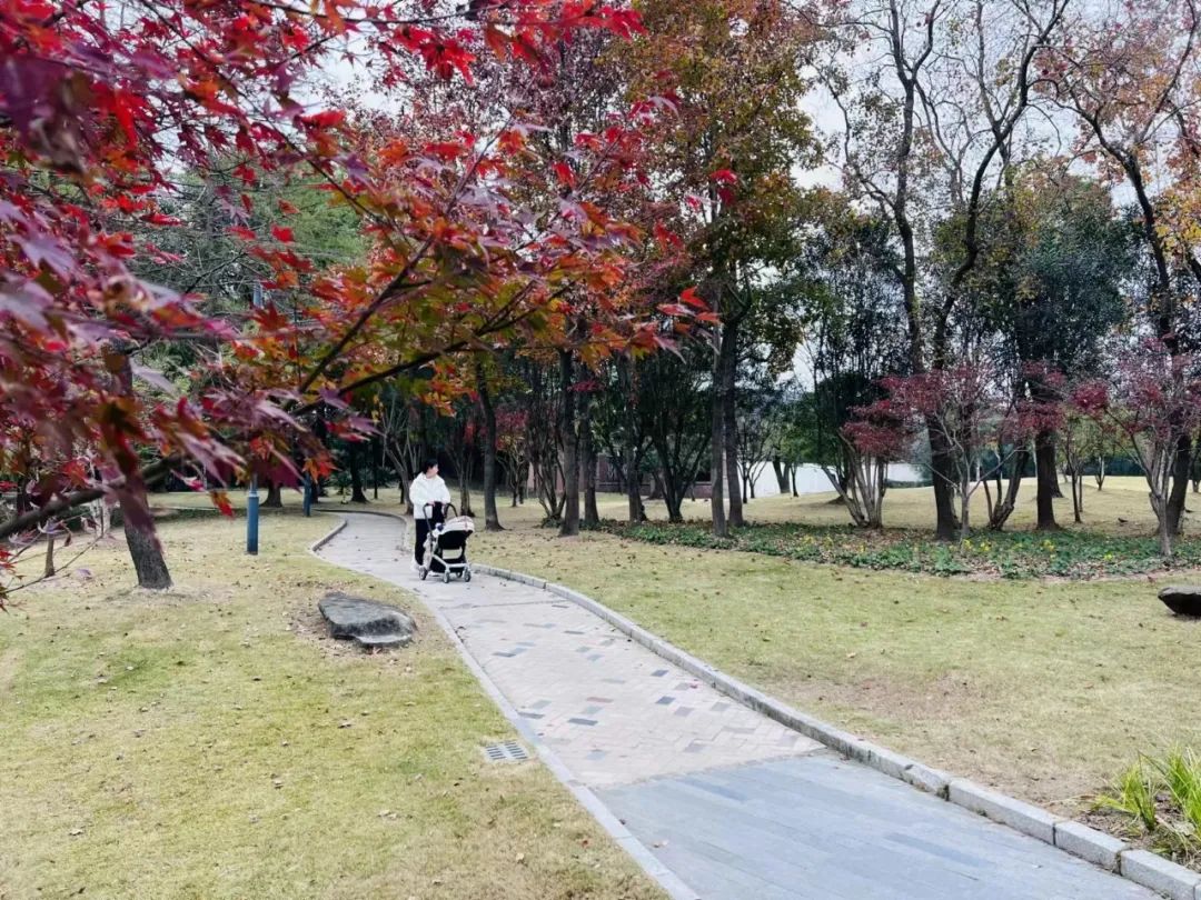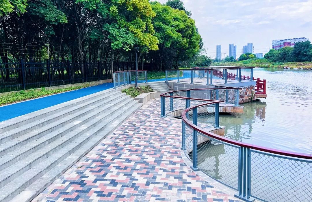 沿着春申塘慢行,绿道沿线公共绿地内保留了桂花、银杏等季节性较强的观赏性绿植,并新建了休憩座椅、沿河安全护栏、亲水平台休闲区等供居民小歇赏景。