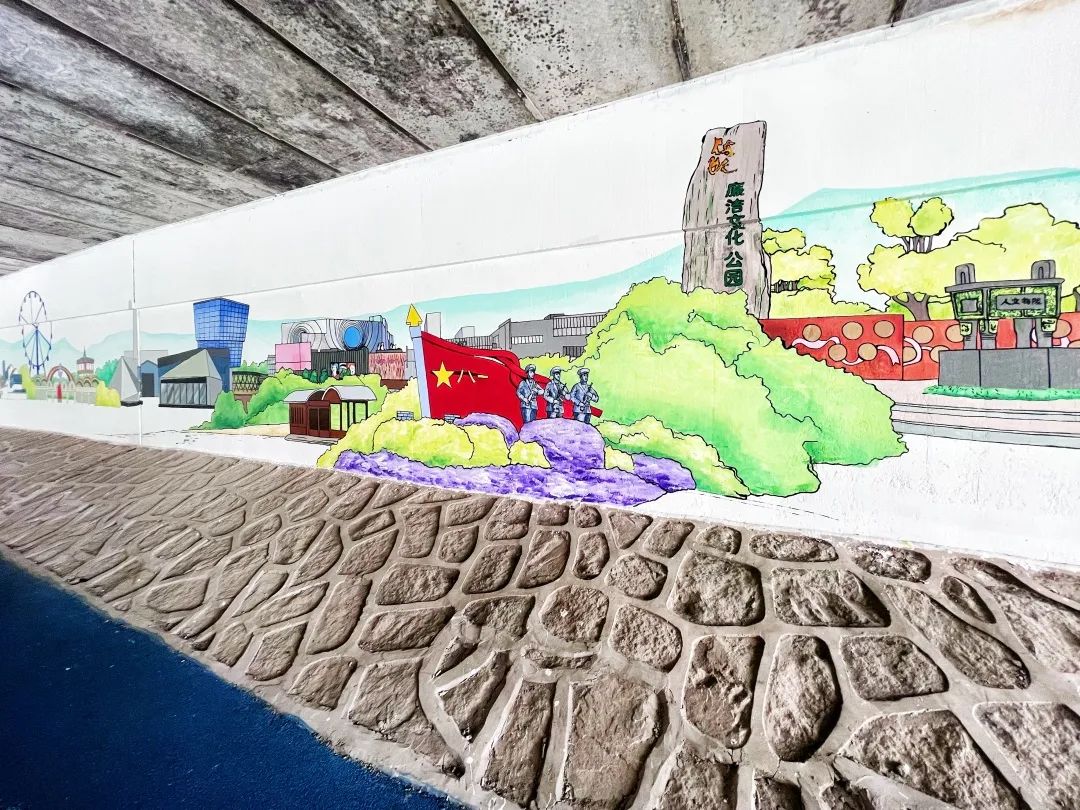 墙绘设计综合了锦江乐园、南方商圈、梅陇特色公园、益梅小院等梅陇具有代表性的点位,展示着梅陇欣欣向荣的城市形象,成为沿河绿道景观带上一条亮丽的风景线。