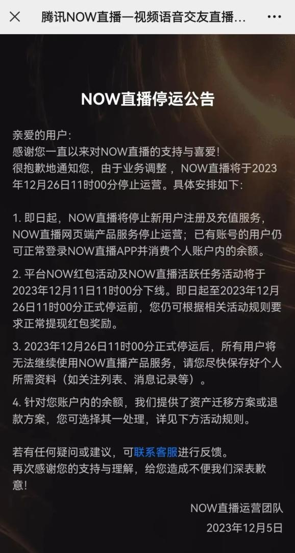 该停运公告显示,即日起,NOW直播将停止新用户注册及充值服务, NOW直播网页端产品服务停止运营;已有账号的用户仍可正常登录NOW直播客户端并消费个人账户内的余额。平台NOW红包活动及NOW直播活跃任务活动将于2023年12月11日11时00分下线。即日起至2023年12月26日11时00分正式停运前,用户仍可根据相关活动规则要求正常提现红包奖励。