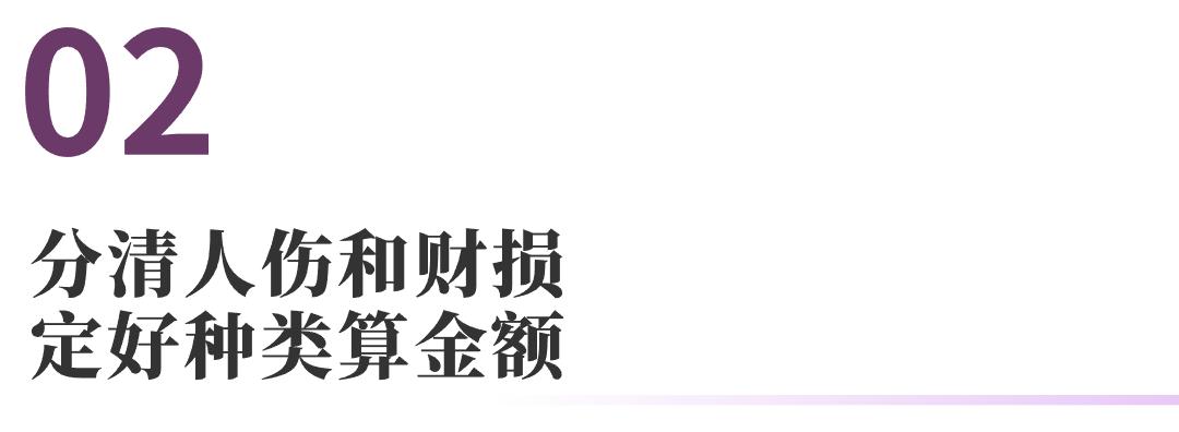 其中死亡伤残费用项下包含护理费、误工费、残疾赔偿金、死亡赔偿金、丧葬费、被扶养人生活费、精神损害抚慰金、医疗辅助器具费、交通费。医疗费用项下包含医疗费、住院伙食补助费、营养费、后续治疗费。财产损失费用项下包含前述招式二中提及的财产损失。