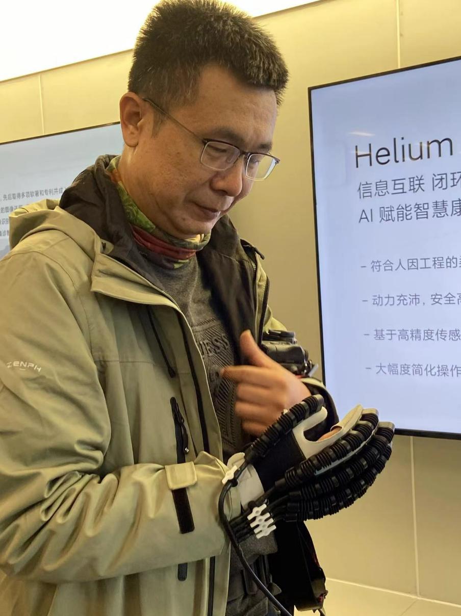 ▲小布体验手部机器人张泰略介绍,团队正在研发镜像疗法,例如右手功能障碍时,利用健康的左手做出打牌的动作,右手的外骨骼就可以让右手精准复刻这一动作,这一对称训练,对脑和手的神经元连接十分有利。