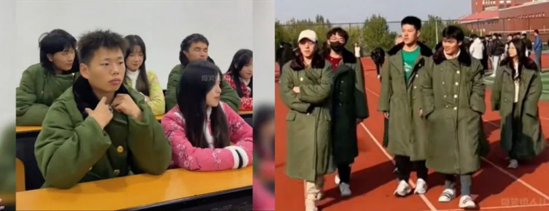 △大学生身着军大衣相较此次刷屏的老式军大衣