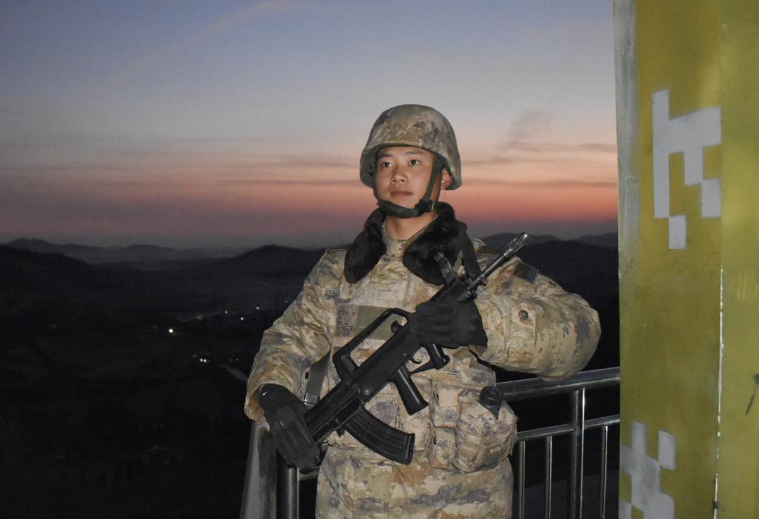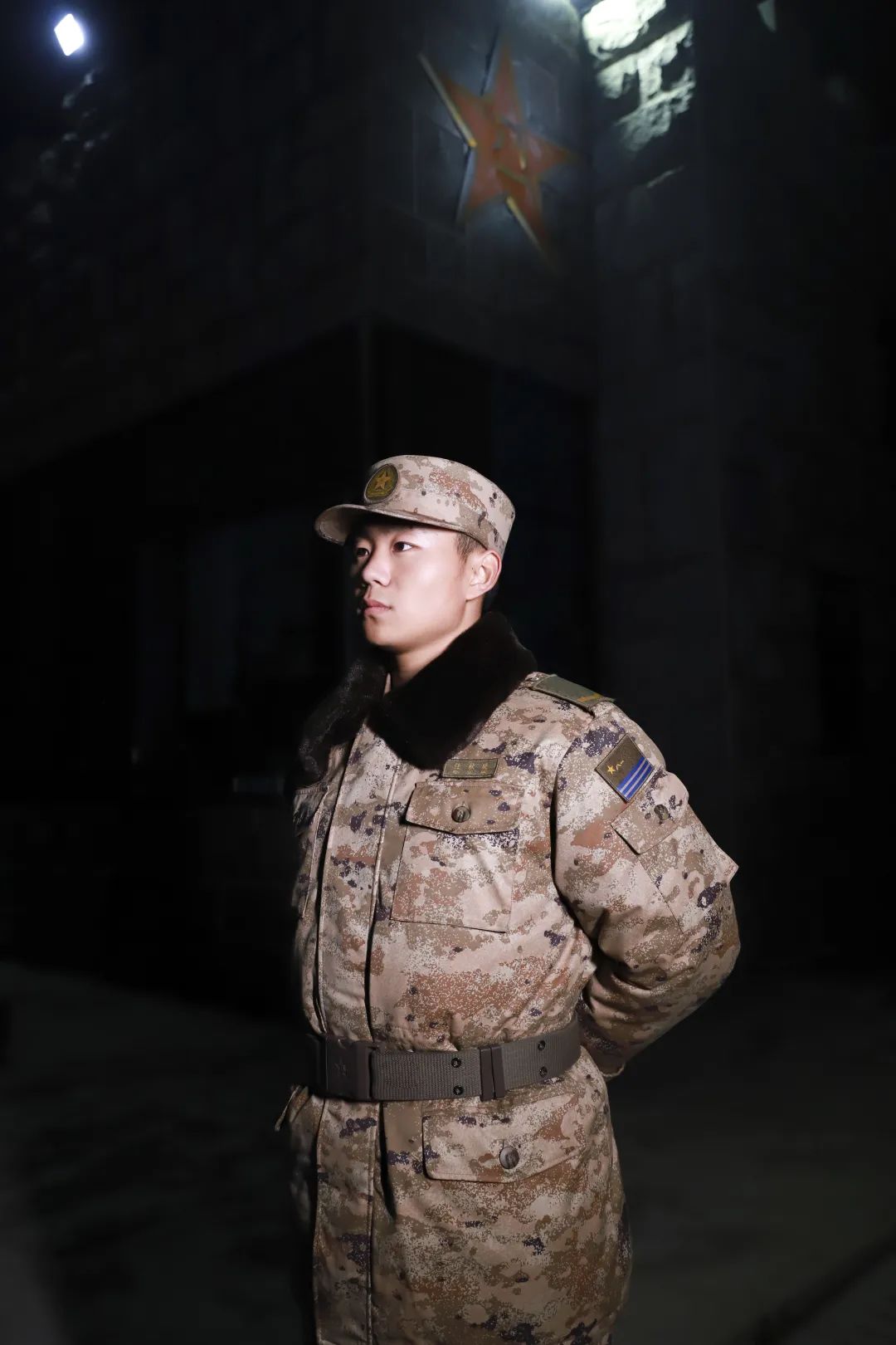 身着21式作训大衣的陆军战士正在岗亭中站岗↓