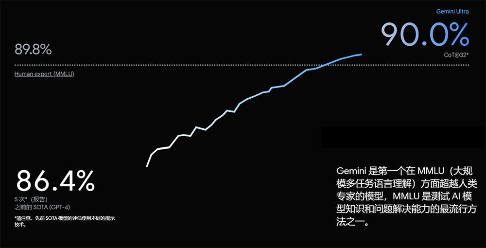 ▲Gemini 1.0全家桶介绍谷歌宣称,Gemini Ultra是首个在MMLU任务上表现优于人类专家的大模型,取得90.0%的成绩。作为对比,人类专家的成绩为89.8%,GPT-4为86.4%。