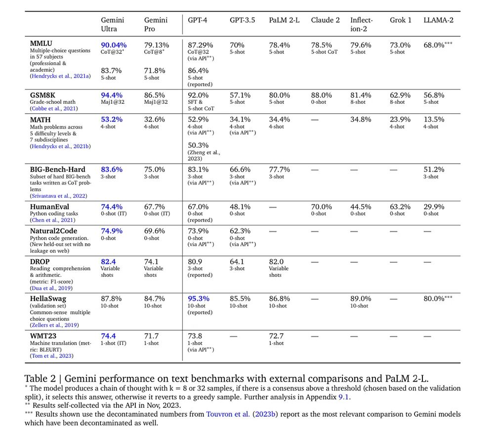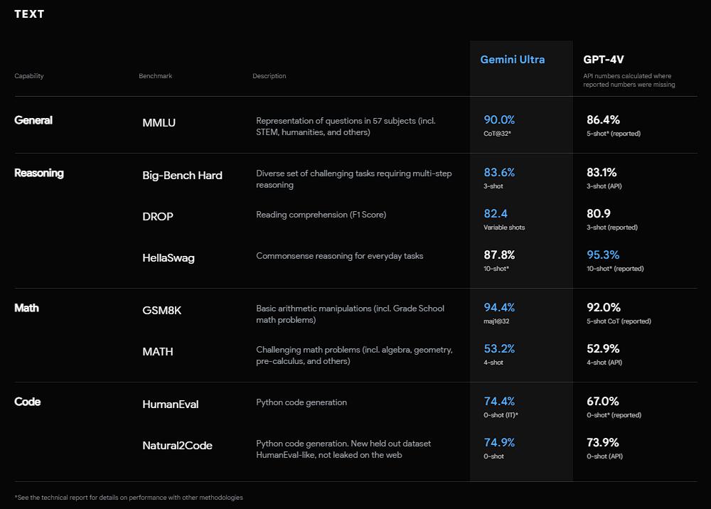 ▲Gemini通过多模态能力辅助做菜在最常规的文本基准测试中,我们更是看到Gemini“超过”2023年发布的一系列大模型,但如果仔细观看数据,我们也能发现事实上,Gemini拉开的差距并不大。