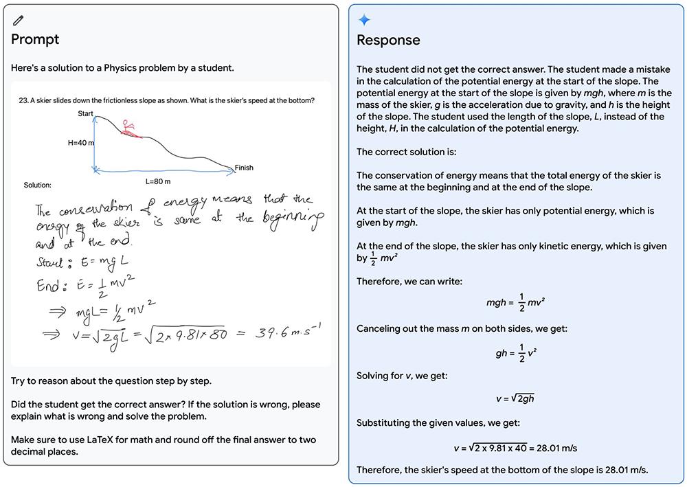 ▲DeepMind首席科学家杰夫·迪恩利用Gemini的多模态推理能力,该模型能够读懂凌乱的笔迹,正确理解问题的表述,将问题和解决方案都转换为数学排版,识别出学生在解决问题时出错的具体推理步骤,然后给出问题的正确解决方案。