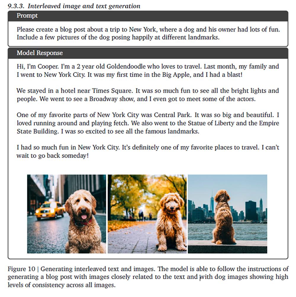 ▲Gemini识别手写笔记并解物理题利用交错图像和文本生成能力,Gemini可以帮助用户写博客。Gemini能够按照提示词生成与文本密切相关的图像,并且所有图像显示出高度的一致性。下图的提示词为:写一篇去纽约游玩的博客,一只狗和它的主人玩得很开心,包括几张狗狗在不同地标欢快摆姿势的照片。