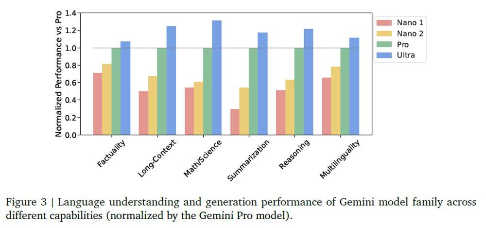▲Gemini的三个版本其中,Gemini Nano还包含两个规模,分别是参数18亿的Nano-1和参数32.5亿的Nano-2,针对低内存和高内存设备。Gemini Nano是通过从更大的Gemini模型中提取知识进行训练的,它经过4位量化处理用于部署,并提供最佳性能。