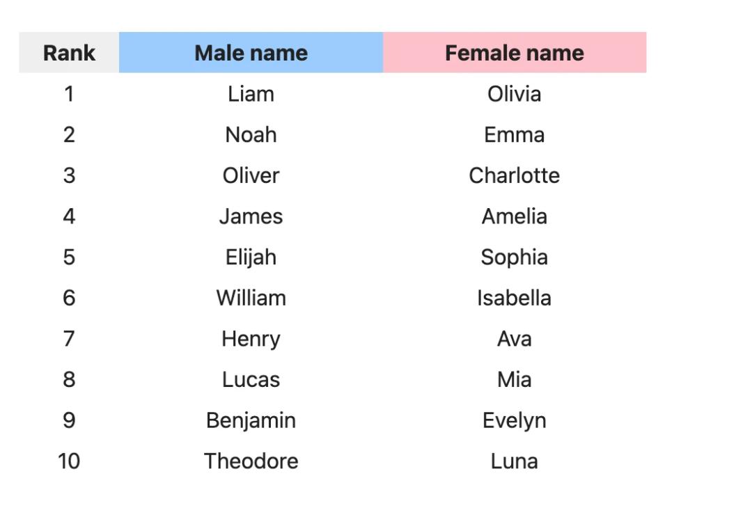 以下数据来自于美国社会安全局(SSA),这份数据统计了2022年美国新生儿取名最多的十个名字。