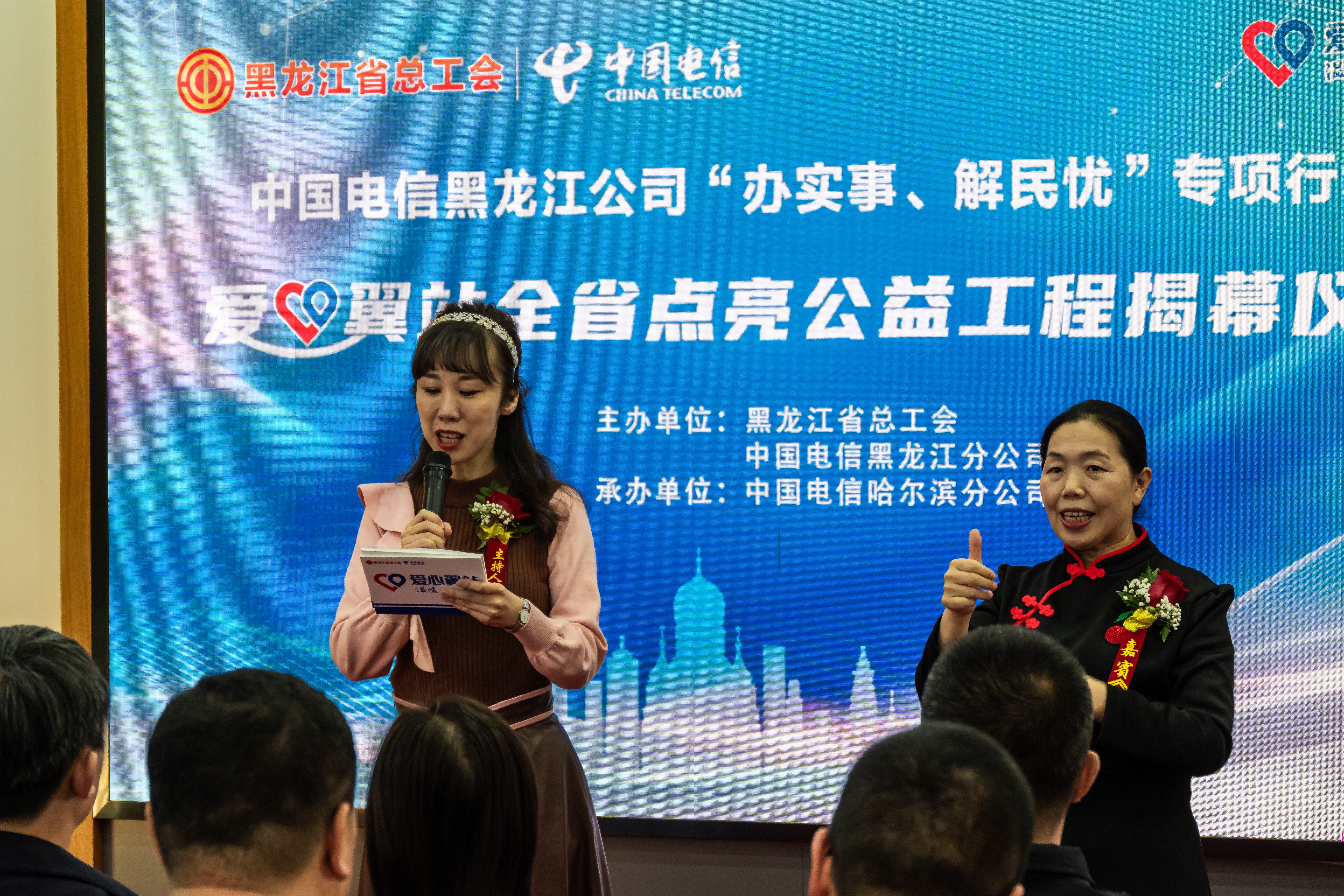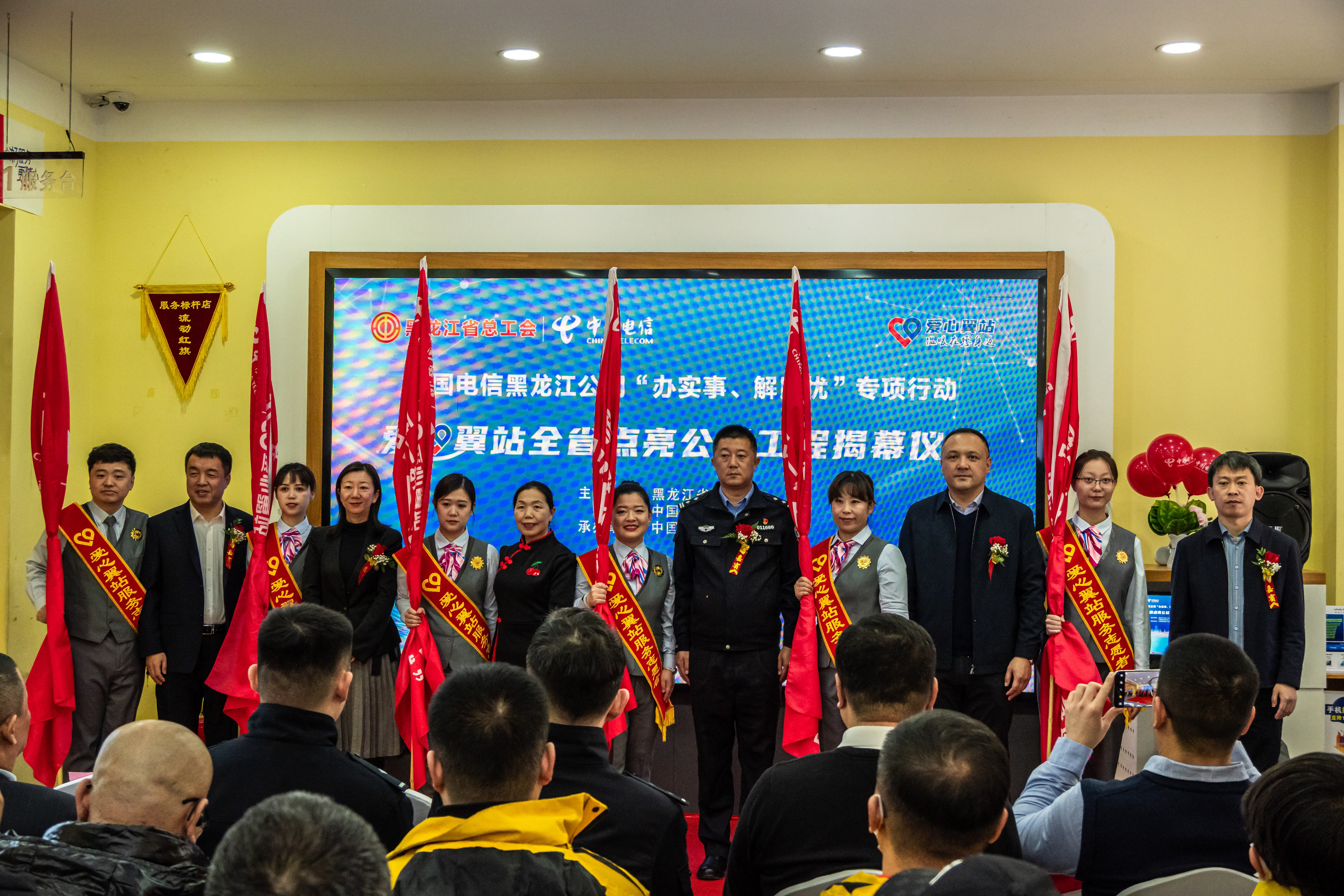 12月7日,中国电信黑龙江公司联合黑龙江省总工会举行的“爱心翼站”全省点亮公益工程揭幕仪式圆满成功。活动上黑龙江省总工会、省委宣传部志愿服务发展中心、哈尔滨市公安局、哈尔滨市南岗区聋人协会等多家单位联合为中国电信黑龙江公司的“爱心翼站”公益升级进行授牌,并对优秀站点进行授旗。同时,宣布中国电信黑龙江公司全1200家“爱心翼站”全面点亮升级公益服务。