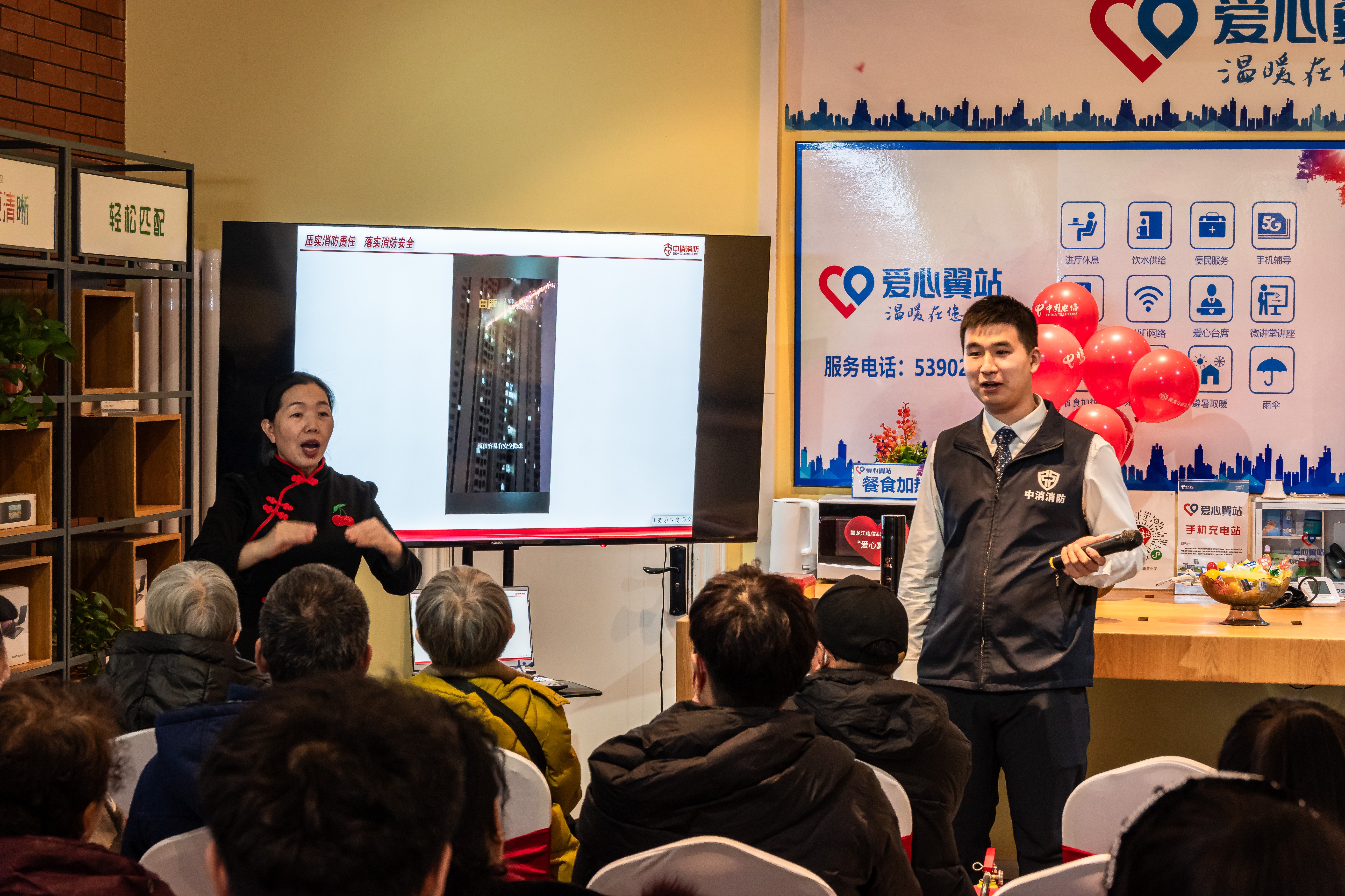 本次仪式得到了社会各界人士的关注,来自环卫、快递、外卖等行业户外劳动者、体瑕人士代表纷纷来到现场参加活动,为便于体瑕人士了解活动内容,整个仪式全程进行了手语解说。活动当日特邀黑龙江省中消消防技术咨询服务中心专家为现场嘉宾、电信用户举办了一场“消防安全知识讲座”。