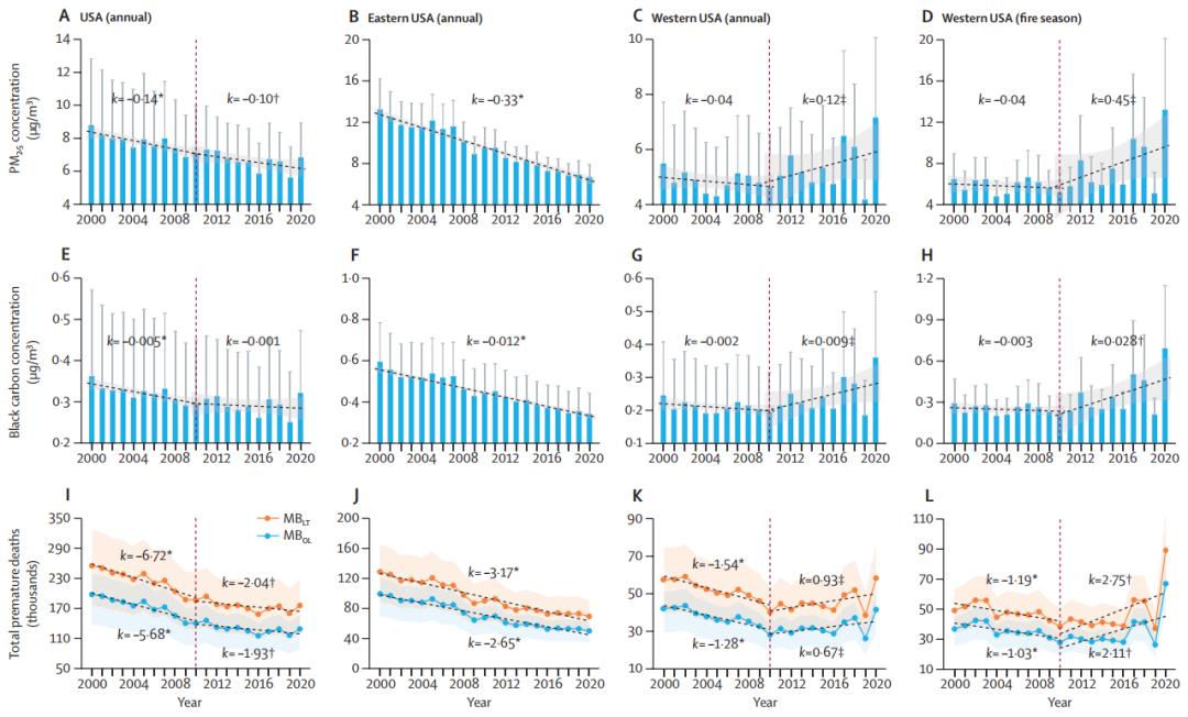 图1.美国2000-2020年年平均以及火季(7-10月)空气污染和死亡负担时间序列曲线图,其中I-L中的橙色线和蓝色线分别表示考虑或不考虑BC较大毒性时与PM2.5相关的过早死亡估计值
