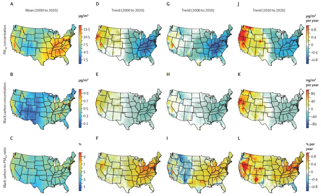 PM2.5对空气质量、气候变化和公共卫生产生重要影响。在过去的十年中,美国大陆改善空气质量和公共健康的长期趋势受到了不断增加的火灾排放的干扰,这可能抵消了人为排放的下降。公众对于PM2.5污染对健康结果的长期和急性影响有很高的认识,而关于野火排放产生的黑碳(BC)对具体健康影响的认识却非常有限,特别是关于全美国长期BC估算的研究较少。本研究旨在估算美国BC和PM2.5浓度及可归因的死亡负担长期变化趋势。