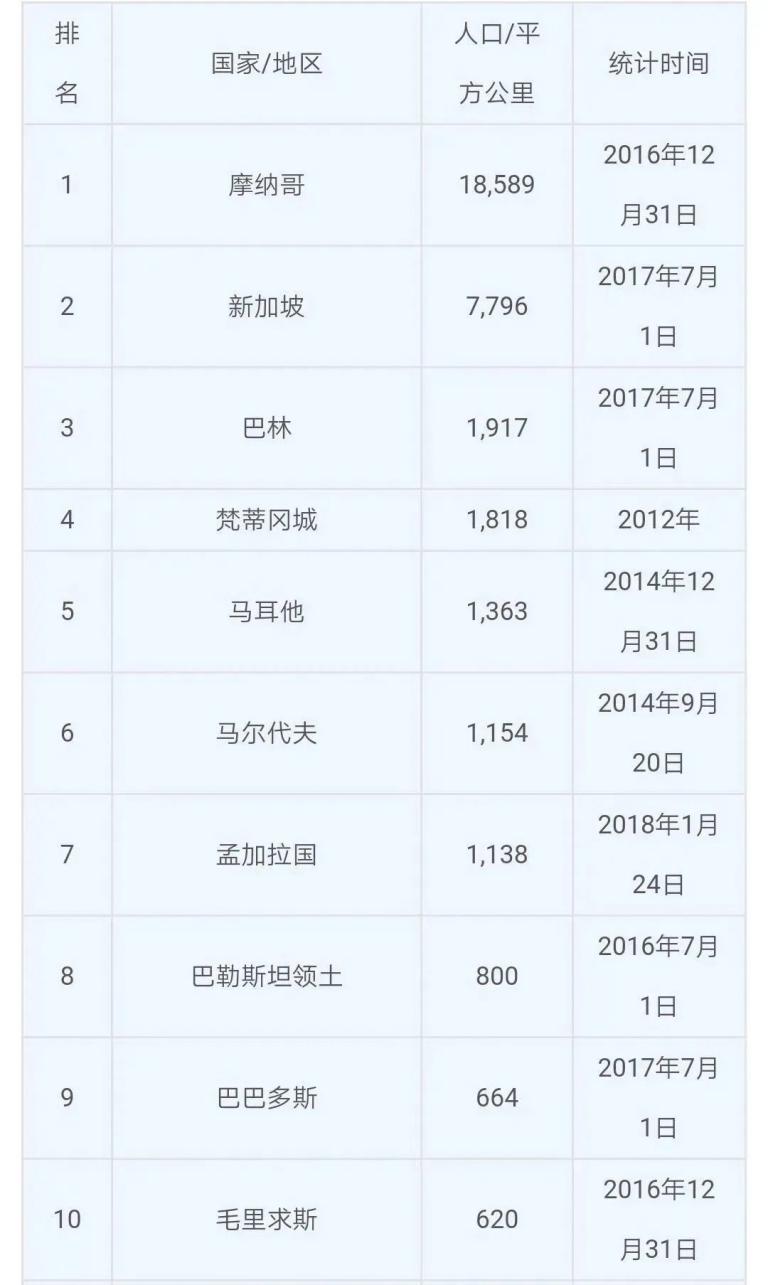其实,世界上人口密度最高的国家是法国的国中国——摩纳哥,这个走几步路就出境的小国,人口密度达到18589人/平方公里,是中国的百倍以上,新加坡排名第二,达7915人/平方公里,是中国的54倍。以这两个国家极小的国土面积,大家都很容易理解。
