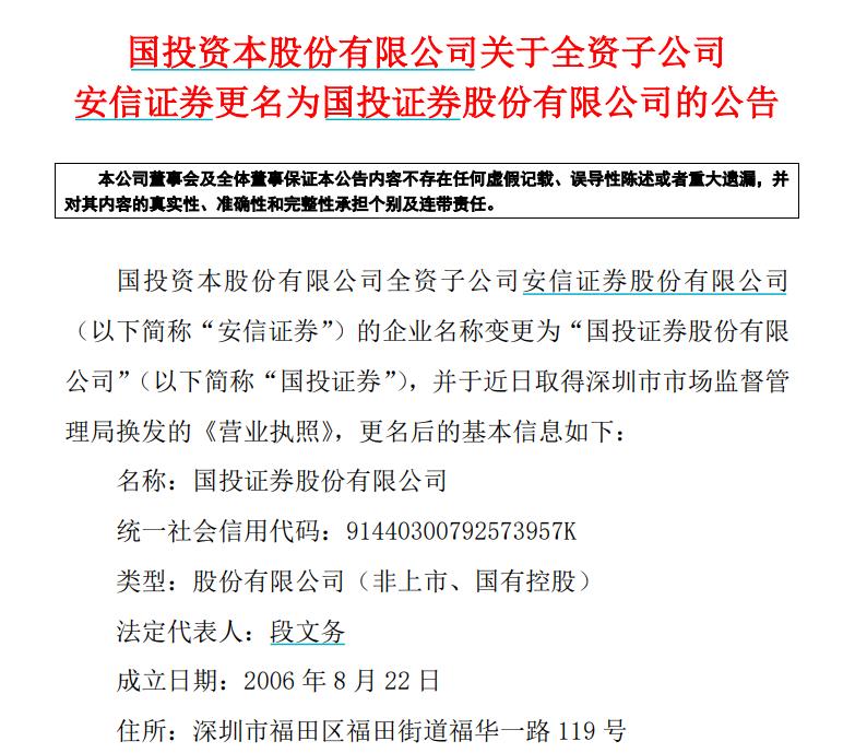 12月8日,国投资本发布公告称,旗下全资子公司安信证券基于其战略定位、品牌规划与自身发展的需要,现将公司名称由“安信证券股份有限公司”变更为“国投证券股份有限公司”,并于近日取得深圳市市场监督管理局换发的《营业执照》。