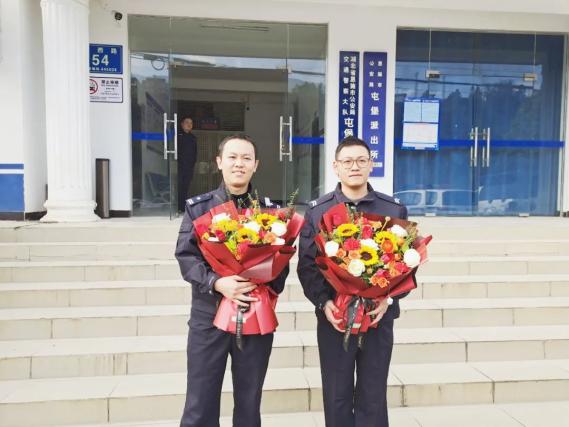 向一路护送的民警黄大学、辅警何丰