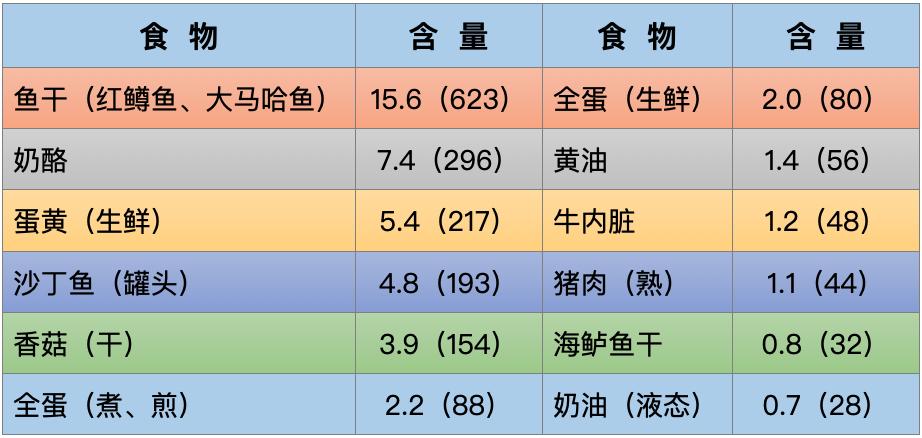 (2)适当增加海鱼、动物肝脏和蛋黄等维生素D含量较高食物的摄入。常见食物中维生素D的含量如下表。