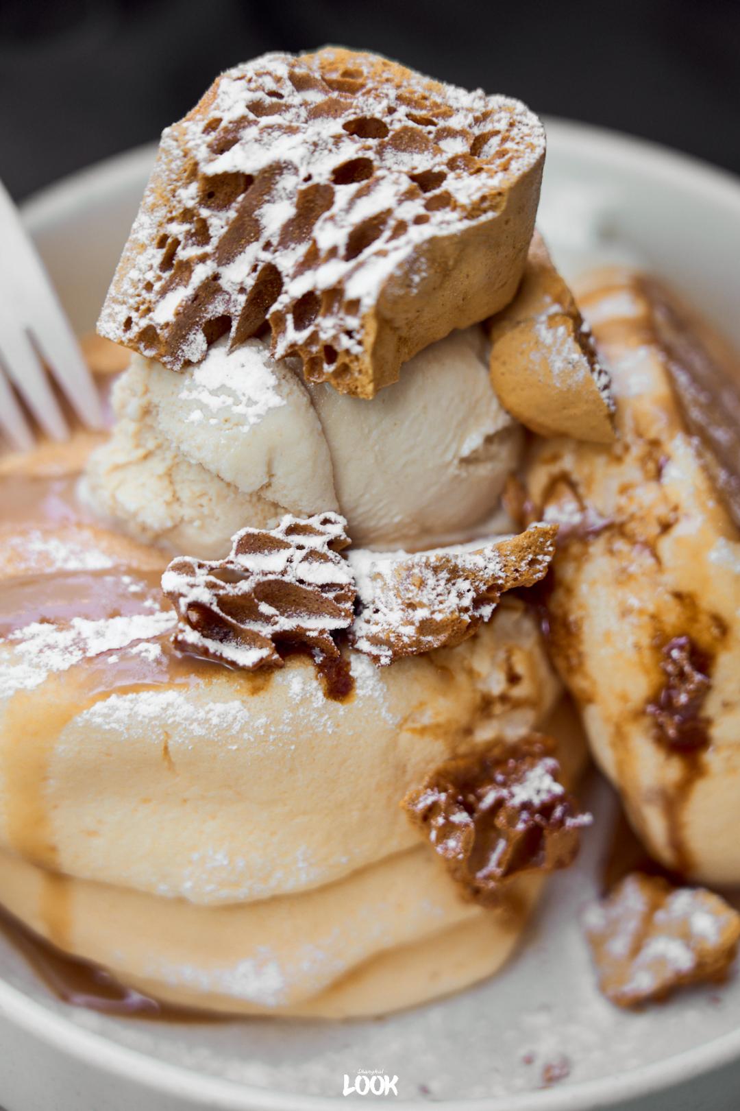 焦糖冰淇淋也不偏甜,和热乎乎的松饼搭配,虽是极冷极热组合,但口感却出奇的好。配上淡奶油的松饼更加松软,有种入口即化的感觉。比较难见到的搭配元素