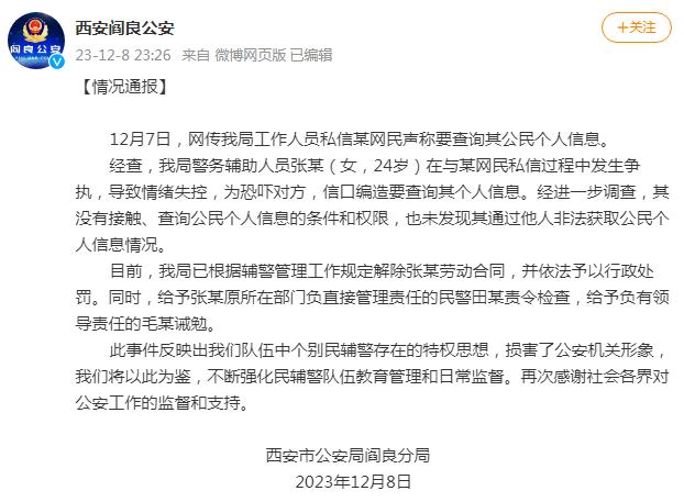 经查,我局警务辅助人员张某(女,24岁)在与某网民私信过程中发生争执,导致情绪失控,为恐吓对方,信口编造要查询其个人信息。经进一步调查,其没有接触、查询公民个人信息的条件和权限,也未发现其通过他人非法获取公民个人信息情况。