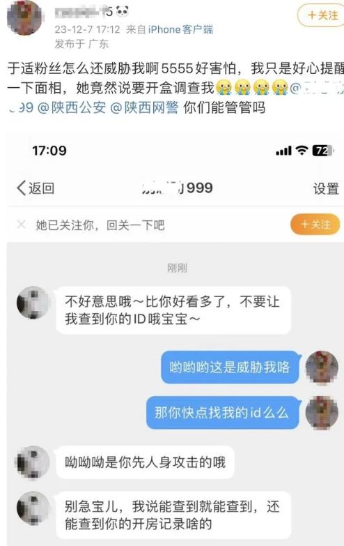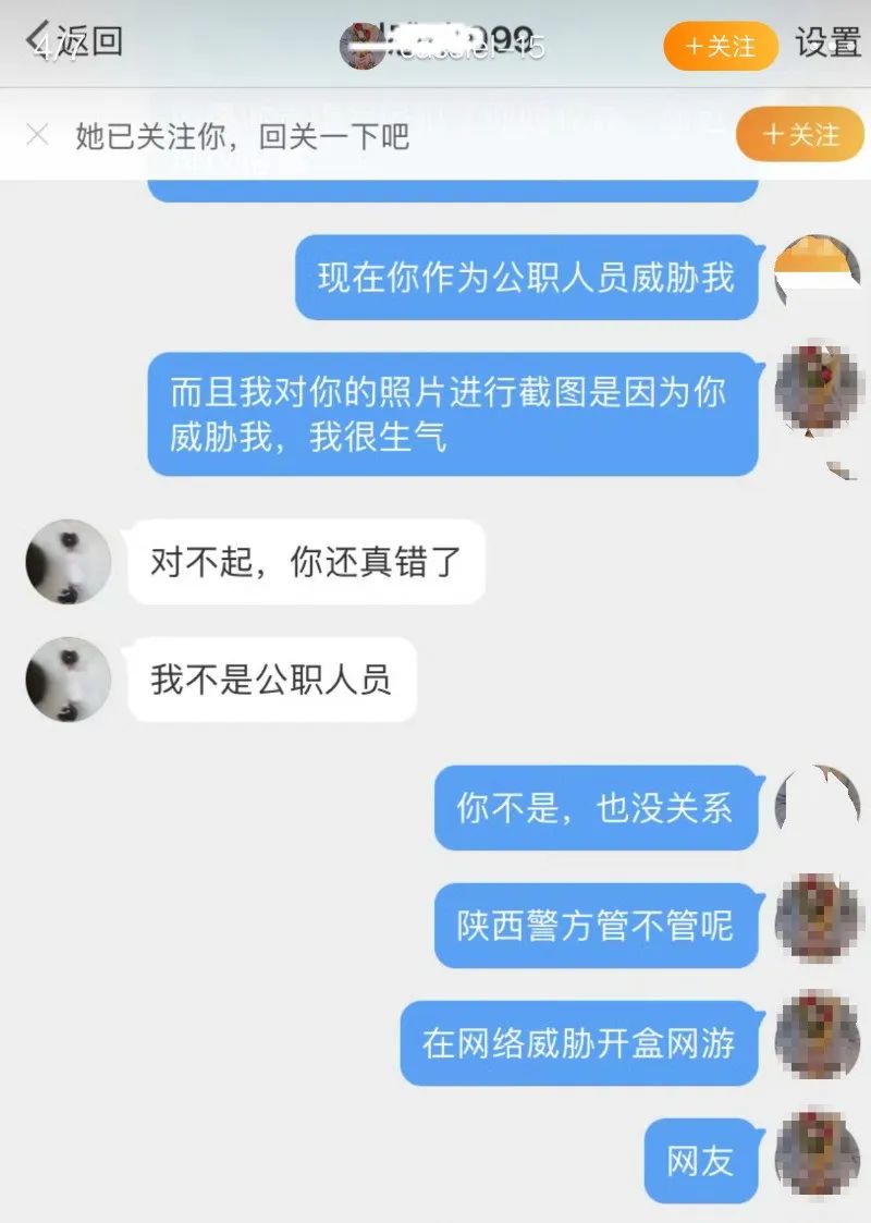 12月7日,网传陕西西安阎良公安分局工作人员私信网友,威胁声称要查询网友的个人信息。