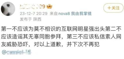 据报道,这名疑似警务人员7日晚曾发布微博道歉,称“不应该为莫不相识的互联网明星强出头”“不应该私信素人网友威胁恐吓”等。记者8日再次查看时,发现以上微博内容均已被删除。