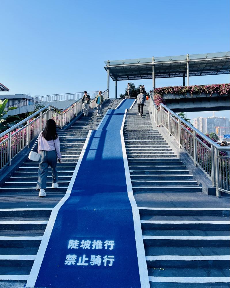 首先是对人行天桥进行改造。人行天桥作为行人、非机动车通行的立体交通设施,在慢行交通系统中发挥着重要作用。为使天桥改造工作不影响市民日常出行,改造后天桥更加贴近市民需求,龙华管理局多措并举开展人行天桥改造工作。一方面全面梳理辖区内人行天桥情况,按照轻重缓急制订改造计划,今年内将完成14座人行天桥改造。另一方面以精简实用为原则推进改造工作,如对损坏较少且防滑性能达标的天桥铺装予以保留,仅对梯道实施改造,且根据人流量等情况因地制宜确定推行道位置。