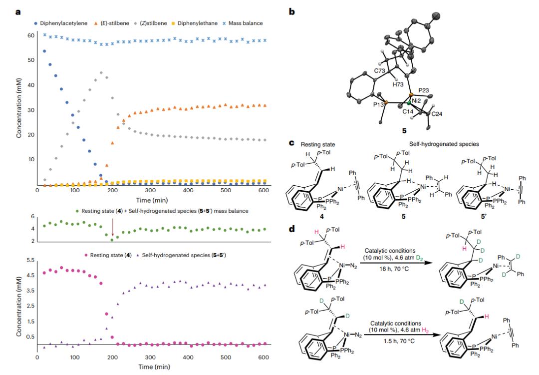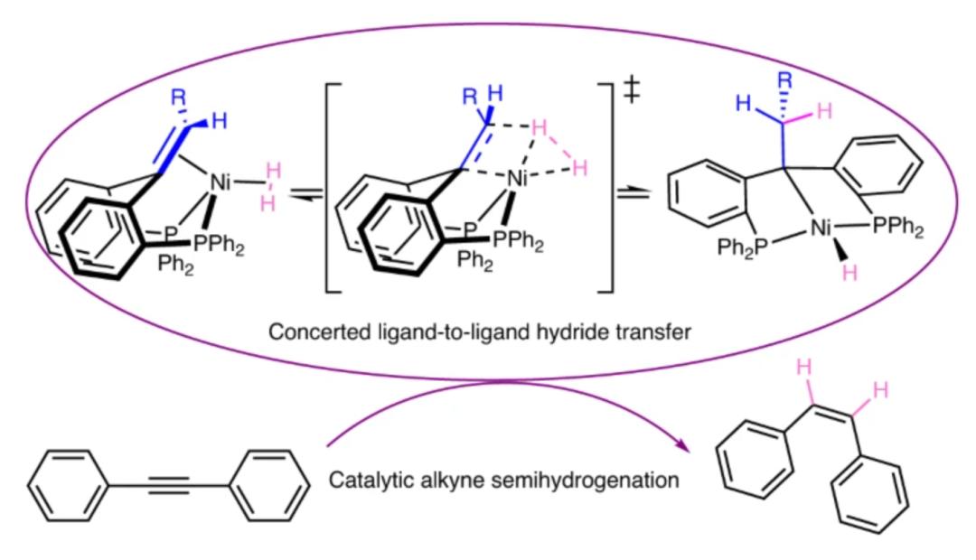 以两个膦配体和一个中心烯烃为特征,不寻常钳形配体支持非经典Ni–H2络合物和配体-配体氢转移LLHT的Ni(烷基)(氢化物)产物形成,从而与溶解的H2快速平衡。在二苯乙炔的半氢化中,证明了这种协同H2活化机理,对于催化的有用性。