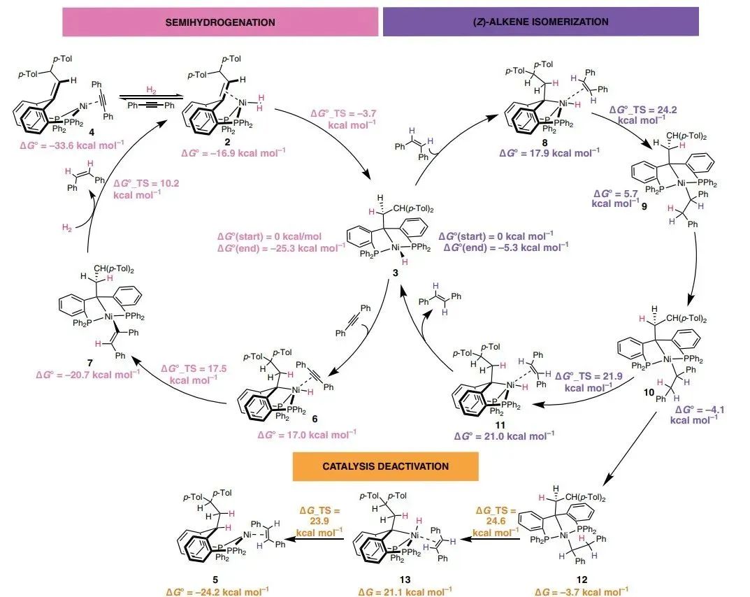 图5:计算了二苯乙炔半氢化和(Z)-二苯乙烯异构化的催化循环,并计算了形成配合物5的途径。文献链接