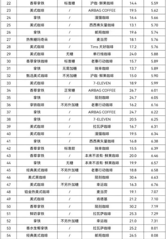 据悉,福建消委会于今年8月对现制现售咖啡产品开展比较试验,对福州市20家咖啡销售单位的59款现制现售咖啡进行采样,样品涉及瑞幸、星巴克、幸运咖、COTTI COFFEE等20个市面主流品牌,包括美式咖啡、拿铁和风味拿铁等不同品类,基本涵盖市面在售的现制现售咖啡产品。