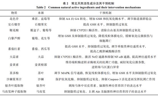 这些天然活性成分主要分为黄酮类物质、多酚类物质、其他的天然活性物质以及复合提取物。黄酮类物质是一种广泛存在于豆科、芸香科、玄参科等自然界植物中的低分子量化合物,如花色苷、安石榴苷等。多酚类物质是一类普遍存在于植物的皮、根茎、叶中的重要次生代谢产物,如鞣花酸、白藜芦醇、茶多酚等。而萜类、醚类、生物碱等其他植物源天然活性物质也是自然界中常见的次生代谢物,如番茄红素、大蒜素等。除此之外,一些复合提取物在在预防和治疗 AA 神经毒性方面也有着显著的效果。