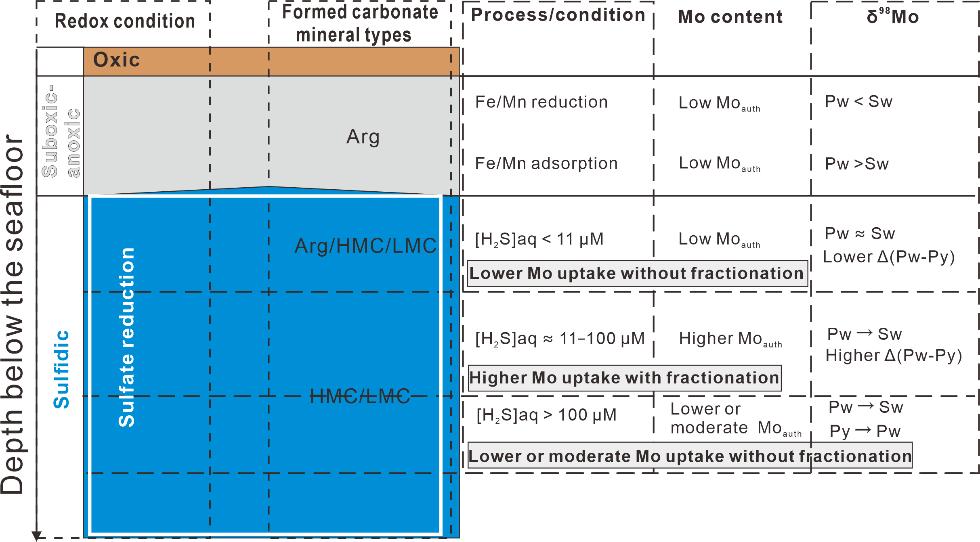 氧化还原敏感元素钼(Mo)的含量及同位素组成(δ98Mo)是重建地质历史时期大气-海洋系统氧化还原状态的有力工具。精准解释沉积记录的δ98Mo信息需要全面了解其在早期成岩过程中钼的埋藏路径和同位素分馏机制。海洋沉积物中的自生钼(Moauth)在记录海水δ98Mo组成和生物地球化学过程中具有很大的潜力。然而,目前对控制自生Mo同位素特征(δ98Moauth)的因素仍然知之甚少。