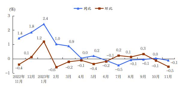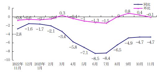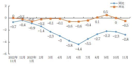 据国家统计局浙江调查总队调查数据显示,2023年11月浙江工业生产者出厂价格同比下降2.8%,环比下降0.5%。工业生产者购进价格同比下降4.7%,环比下降0.1%。浙江工业生产者出厂价格涨跌幅(%)