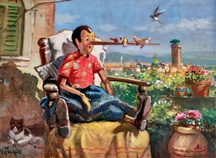 当匹诺曹开始说谎时,鼻子开始变长,匹诺曹继续说,鼻子就继续变长,他终于忍不住哭出来了。