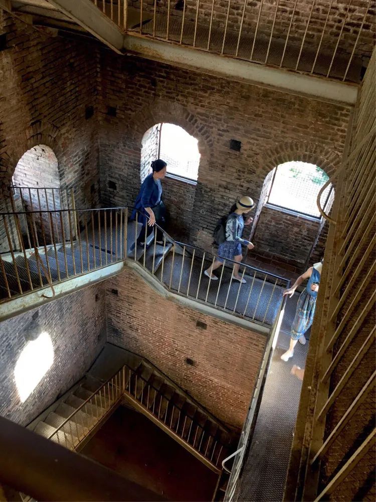 沿着楼梯旋转,从水泥阶梯走到钢制阶梯,眼前的景色也在慢慢变化,顶上塔顶,环顾四方,卢卡小镇尽收眼底。(这张照片是旋转往下)