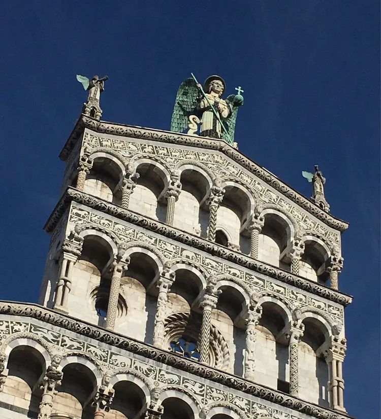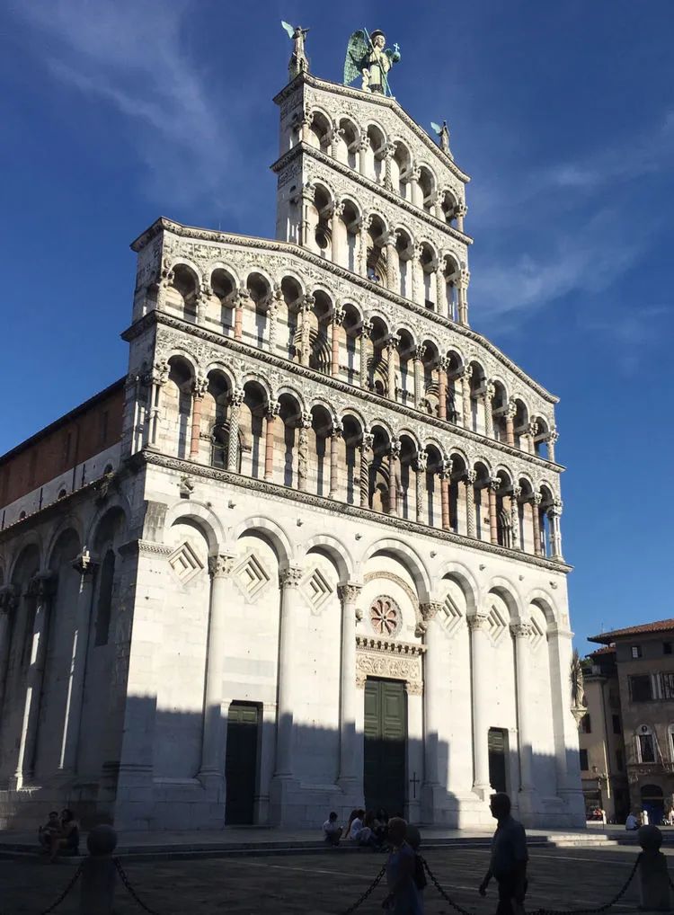 圣米歇尔教堂Chiesa di San Michele in Foro建于1143年,是卢卡最大的教堂。整个教堂包括钟楼在内都是白色的,立面顶端是圣米歇尔的铜像,在阳光下熠熠生辉,很是神圣。