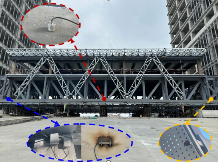 ▲监测点设置在提升作业期间,现场风力因素较为适宜,监测团队对提升全过程进行实时监测,同时采用全站仪、应力应变监测器、风速仪监测等监测设备进行监测,以确保钢连廊在整体抬高过程中避免出现“水平误差”,使钢连廊整体提升安全并达到精准对接,保障每一个钢构件受力处于安全可控状态。