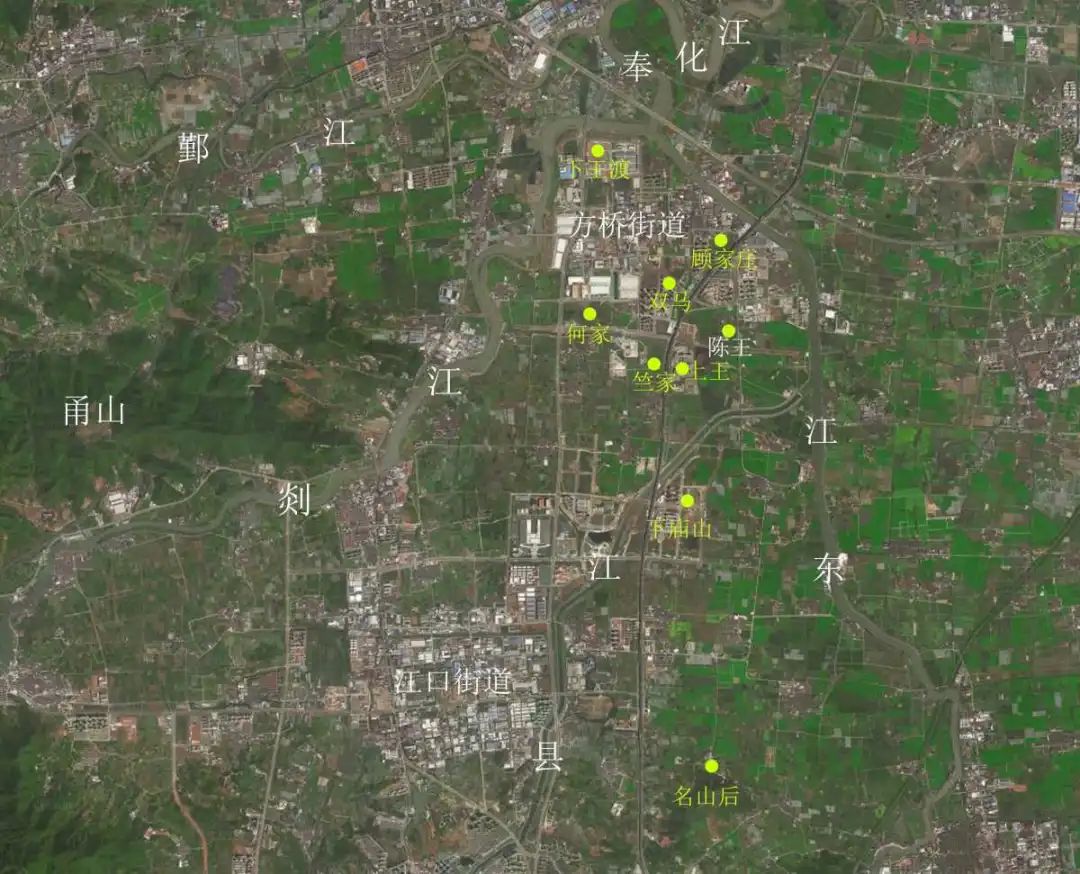 陈王遗址与奉化江流域其它史前遗址相对位置图。陈王遗址海拔2.25米,堆积深度约1.6到2米,自上至下可分为6个层位。
