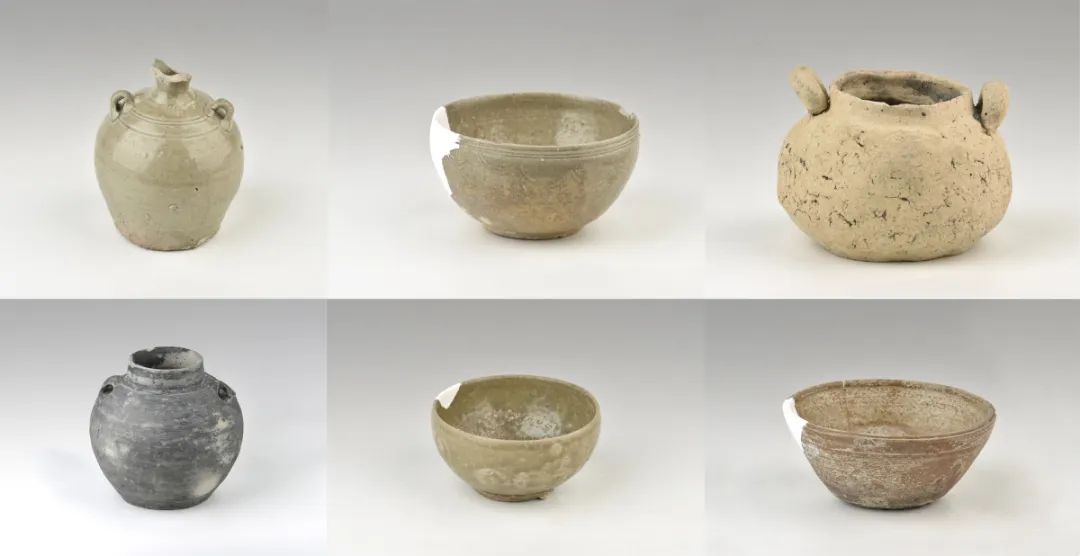 汉六朝时期陶瓷器。汉六朝时期瓷器见有碗、盘、盏、钵、罐、壶、支架。釉色可分为青釉和青黄釉,纹饰有弦纹、莲瓣纹,半圆形水波纹、叶脉纹、竖条纹饰带、同心圆纹、垂帘纹等。这一时期的纹饰刻痕深,刻划较随意。部分器物内外底有支烧痕迹。