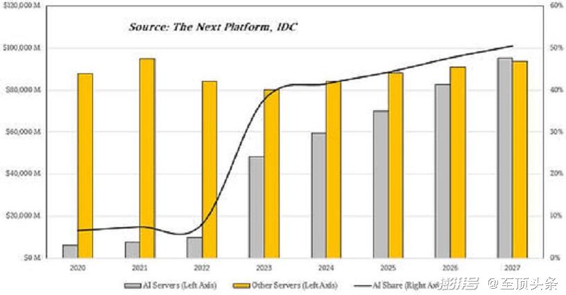 今年10月,我们根据IDC的服务器收支预测整理出电子表格,想要弄清到底有多少钱被花在了AI集群身上。从结果来看,IDC发现2022年AI系统的总销售额还在区区100亿美元以内,但在短短两年之后的2023年,这一数字就会迅速飙升至500亿美元,到2027年稳定增长至1000亿美元,直接在服务器总收入中占据半壁江山。坦率地讲,这样的势头绝对堪称疯狂。