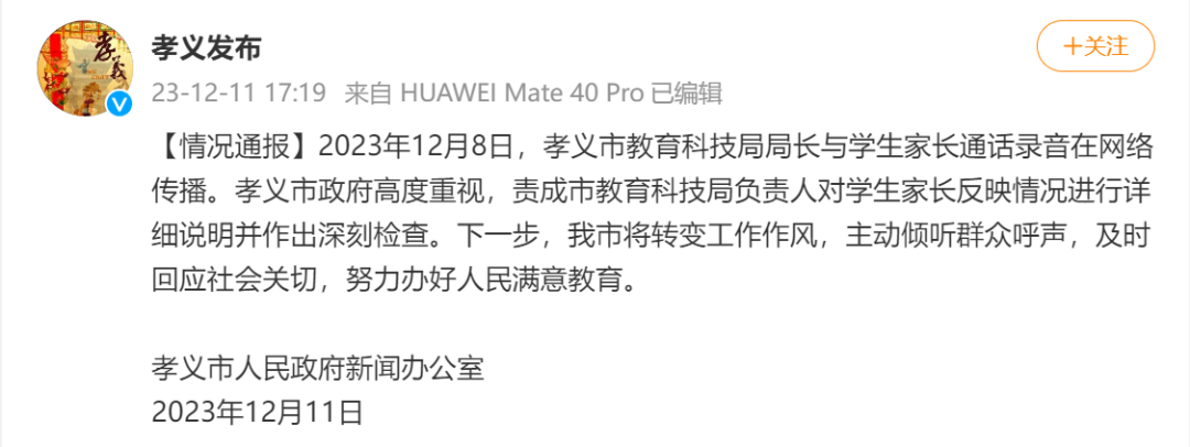 2023年12月8日,孝义市教育科技局局长与学生家长通话录音在网络传播。孝义市政府高度重视,责成市教育科技局负责人对学生家长反映情况进行详细说明并作出深刻检查。下一步,我市将转变工作作风,主动倾听群众呼声,及时回应社会关切,努力办好人民满意教育。