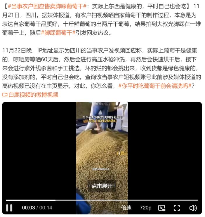 因为脚踩看起来有点膈应,影响食欲。视频迅速在网上产生了很大争议。网友纷纷表示惊恐:我吃葡萄干从来不洗。随后,该农户回应称,东西都是健康的,晾晒房晾晒60天后还会进行高压水枪冲洗,再快速烘干,接下来还会进行紫外线杀菌和手工挑选,收到的货都是绿色健康的,平时自己也会吃。但网友们的议论仍然不能停止。
