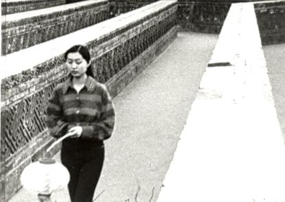 在万花阵中从手持近距跟拍的画面切换到人物的主观视角,再切换到远景,背景音响起宫女嬉笑的声音,迷宫此刻如都市一般让模特迷失,正如她口中所说的:“北京太多地方太相像了,这个地方好像我来过,这个地方我好像也来过,摆在你面前有很多路,要自己去选。”声画组接的自然程度想必经过了严密的构思,以及现场随机应变的能力,充分展现着蒙太奇构成隐喻的魅力。此段看似即兴的部分是导游的解说,但这种临场的捕捉很明显来自预先的人物采访,在这一场景中“即兴与预谋是可以随时互换,无限穿梭的。”
