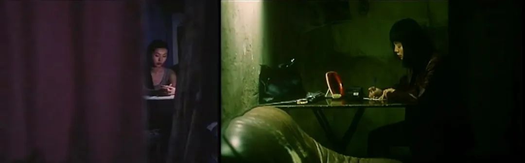 随着小娟的歌声飘荡在地下通道的角落,一个绑着马尾的女人踩着高跟鞋从隧道的一方走来,紧接着下一个镜头她走进门内,两个不同的时空便自然地靠人物的行动衔接而上。人物出场,但没有个人信息的展现,我们不知道她是谁,她叫什么名字,她多少岁…我们只能从画面中获取信息,梳妆镜前的口红,旋转的五彩灯球,摇晃的酒杯…女人坐在沙发上,灯光掠过她的脸庞,空间内的各种细节也从这流动中一一展现。门不停地开关,流行歌曲也不断的变换,这一切并没有画面展现,但始终脱离不开人物的视线,声画之间的剪切隐藏着时间是如何在这昏暗的歌厅内流逝(流行音乐的运用与边缘人物的形象都是贾樟柯电影里时常出现的元素)。