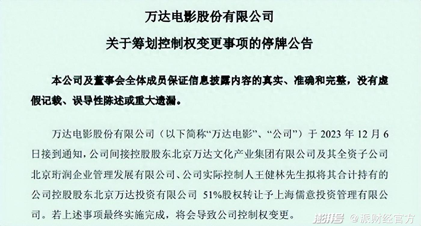12月6日,万达电影公告称,公司实际控制人王健林拟将其合计持有的公司控股股东北京万达投资有限公司51%股权转让给上海儒意投资管理有限公司。若上述事项最终实施完成,将会导致公司控制权变更。